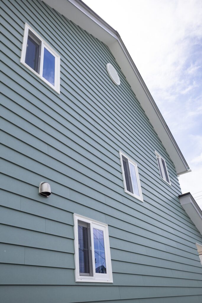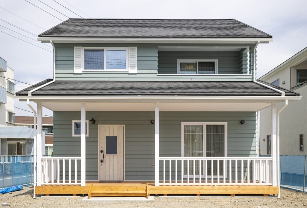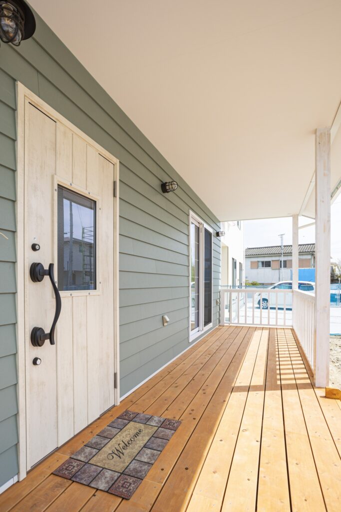 木を重ねたようなラップサイディングと玄関からつながるカバードポーチ。