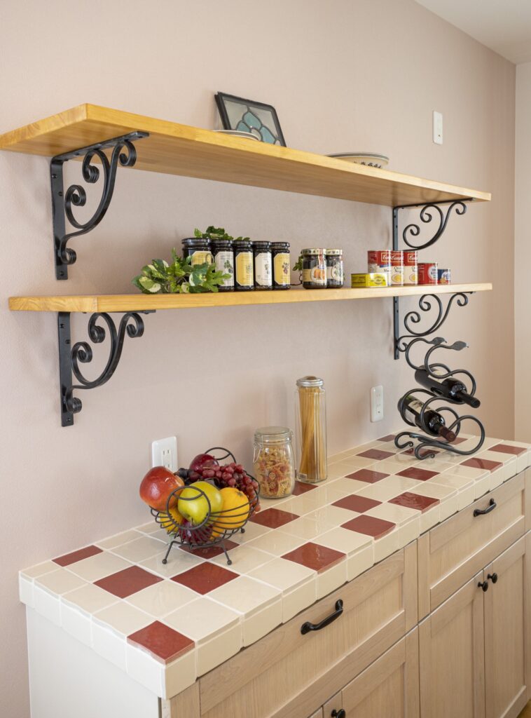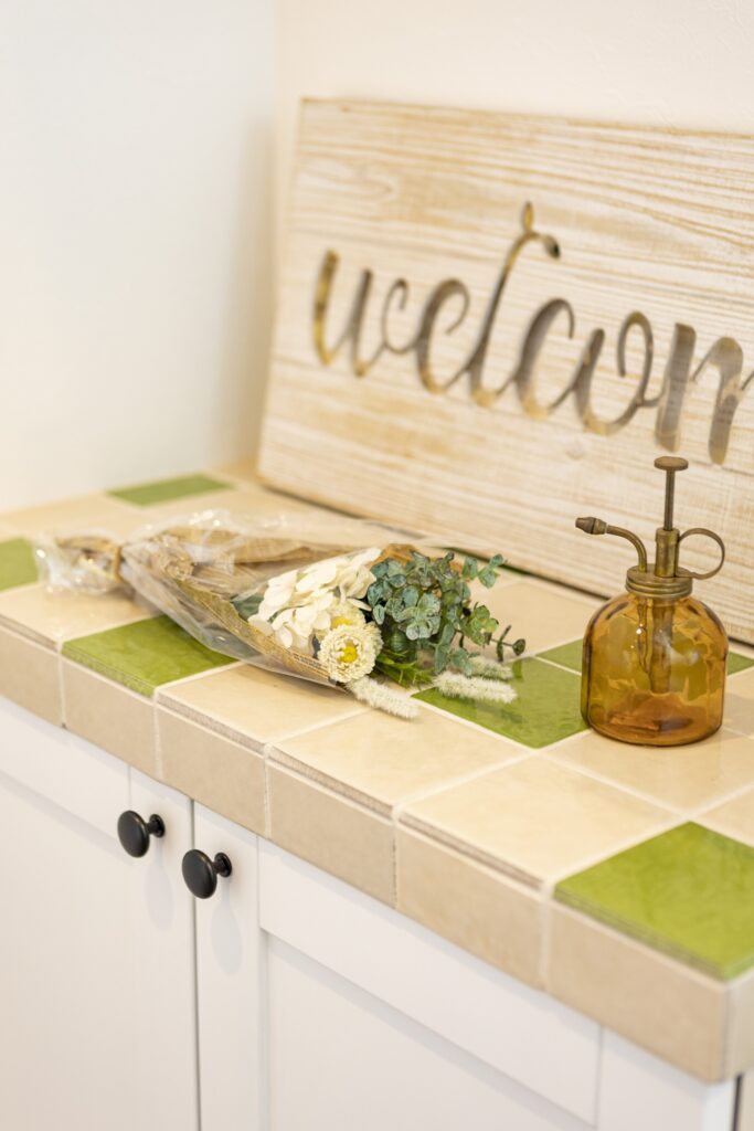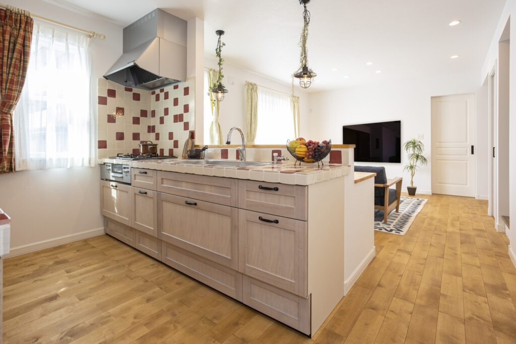 建物の中へ進むと無垢材を使った床やタイル天板がが印象的なキッチンが広がります。