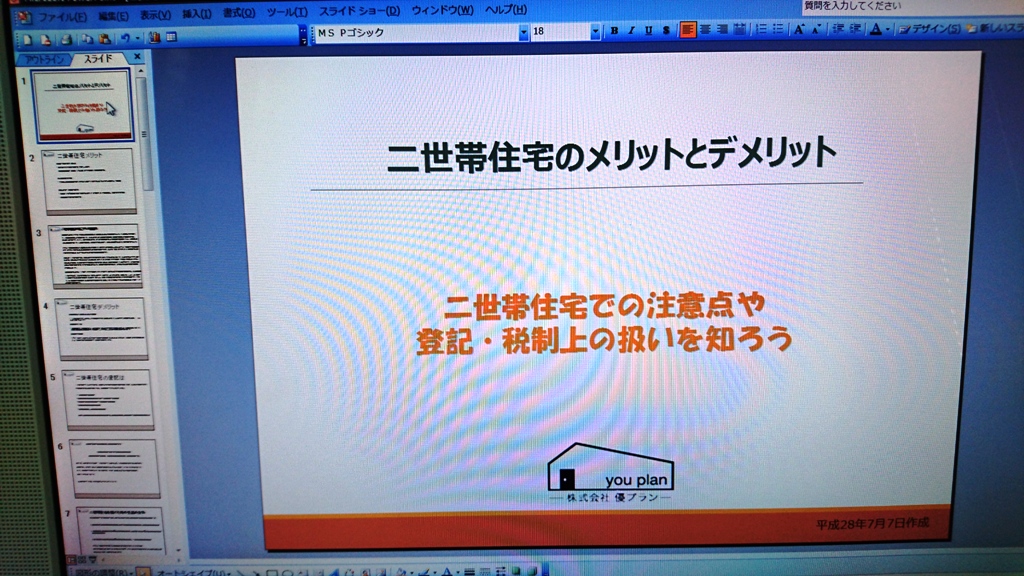 それはさておきコンパス勉強会のワタクシが担当する内容は二世帯住宅のメリットとデメリットです。単純にライフスタイルの注意点などだけではなく、登記の方法や税制についても触れていきたいと思っています。