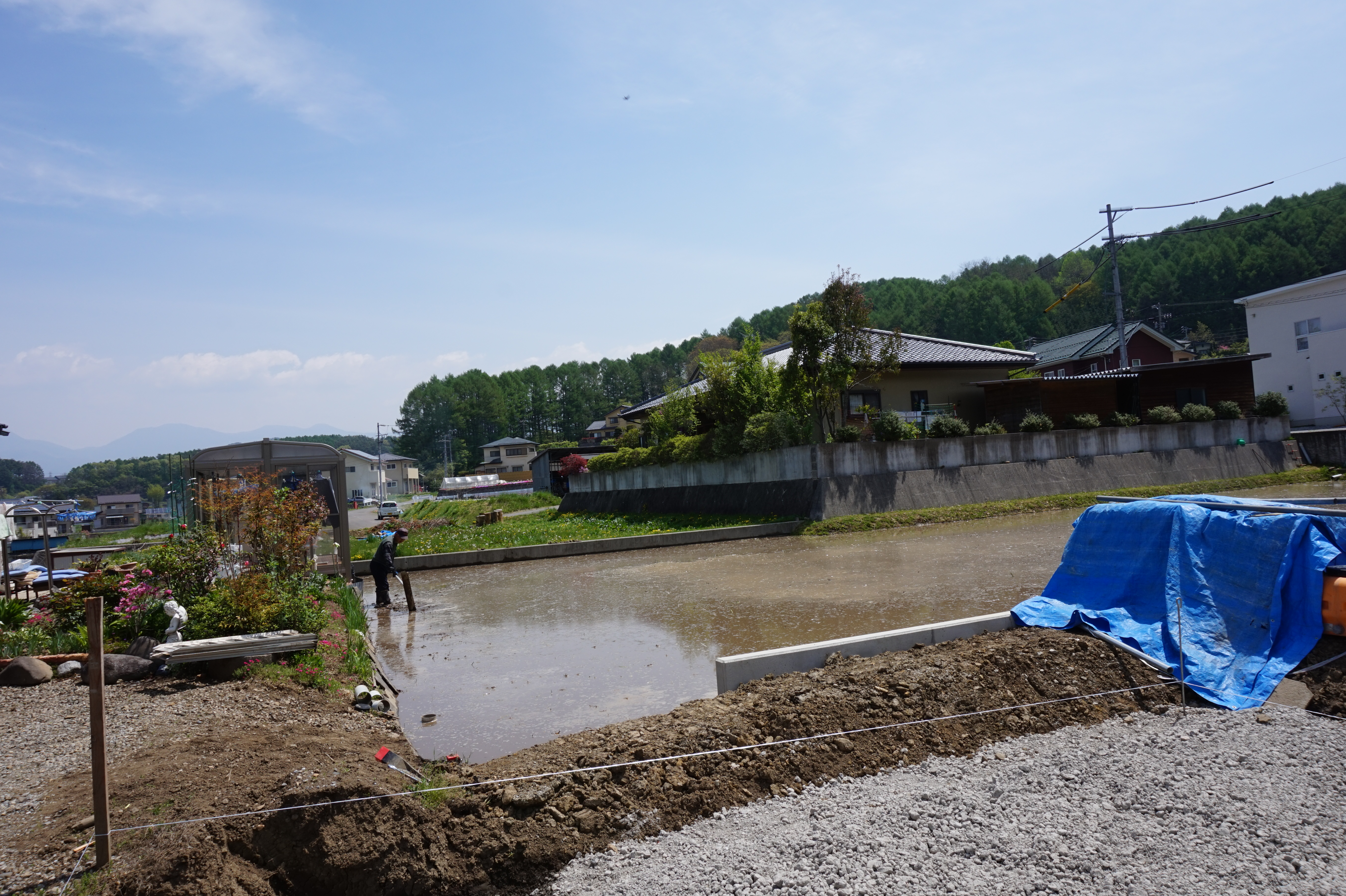 現場のすぐ隣では、田植えの準備のどかな風景が広がります[/caption]