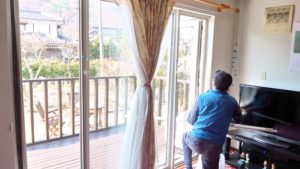 N様邸のサッシは当時としては珍しいオール樹脂サッシ。そして一般的な引き違い戸ではなく、ドアのように開くタイプです。